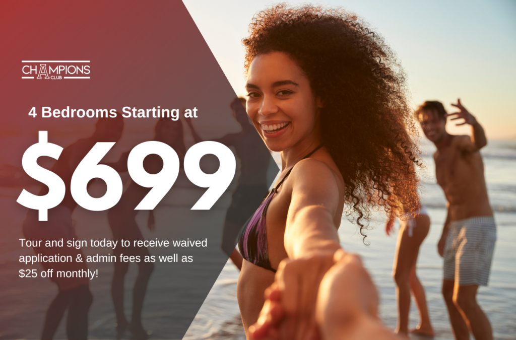 Champions Club is now leasing! Come experience student living at it’s finest! Call now to schedule a tour and secure your apartment.